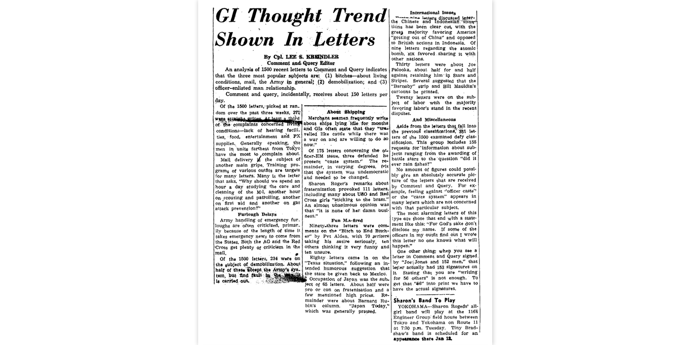 While in the Pacific, Lee was the Editor of the Stars and Stripes Comment and Query, the column that reporting on "enlisted boys' daily life" in the Army.