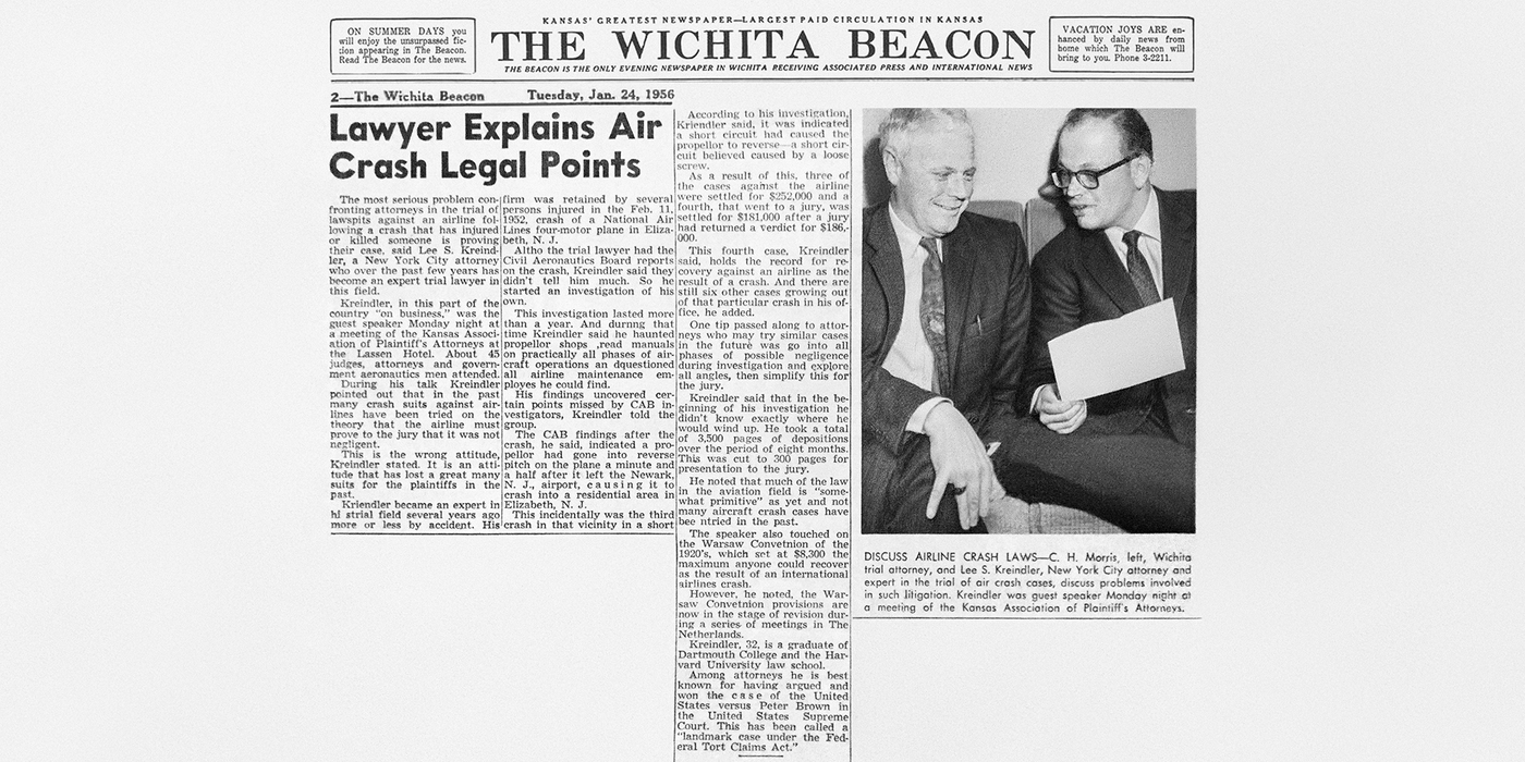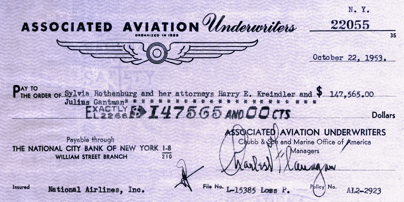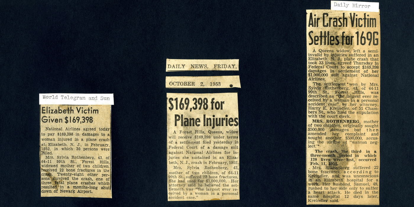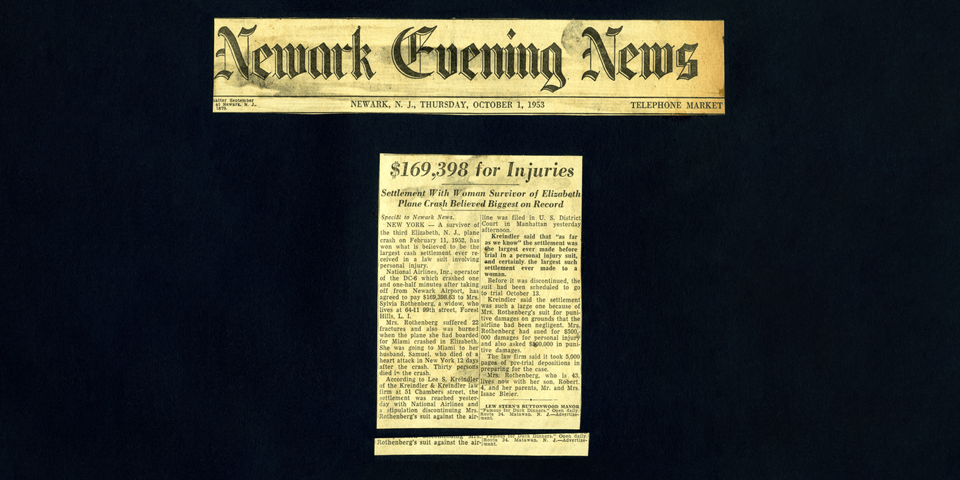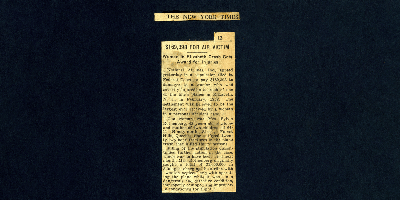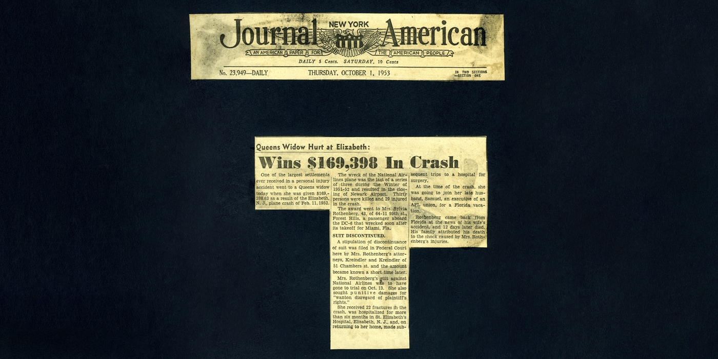 Sylvia Rothenberg arrived at the Kreindler and Kreindler office in November of 1952. At that time, airline crashes were considered acts of God. There was no precedent for air disaster litigation. Sighing, Harry said regretfully, "I'm sorry, but I don't think there is anything we can do for you".
