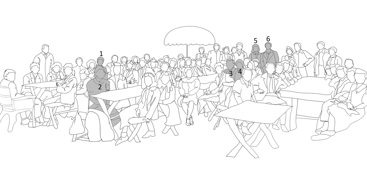 1-Lee, 2-Ronnie, 3-4-Harry and Doris, 5-6-Luisa and Jack Kriendler.