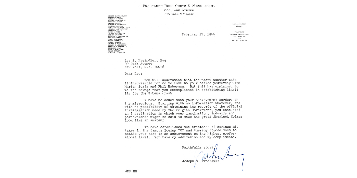 February 17, 1966 — Joseph Proskaeur Letter re: Sabena Settlement.