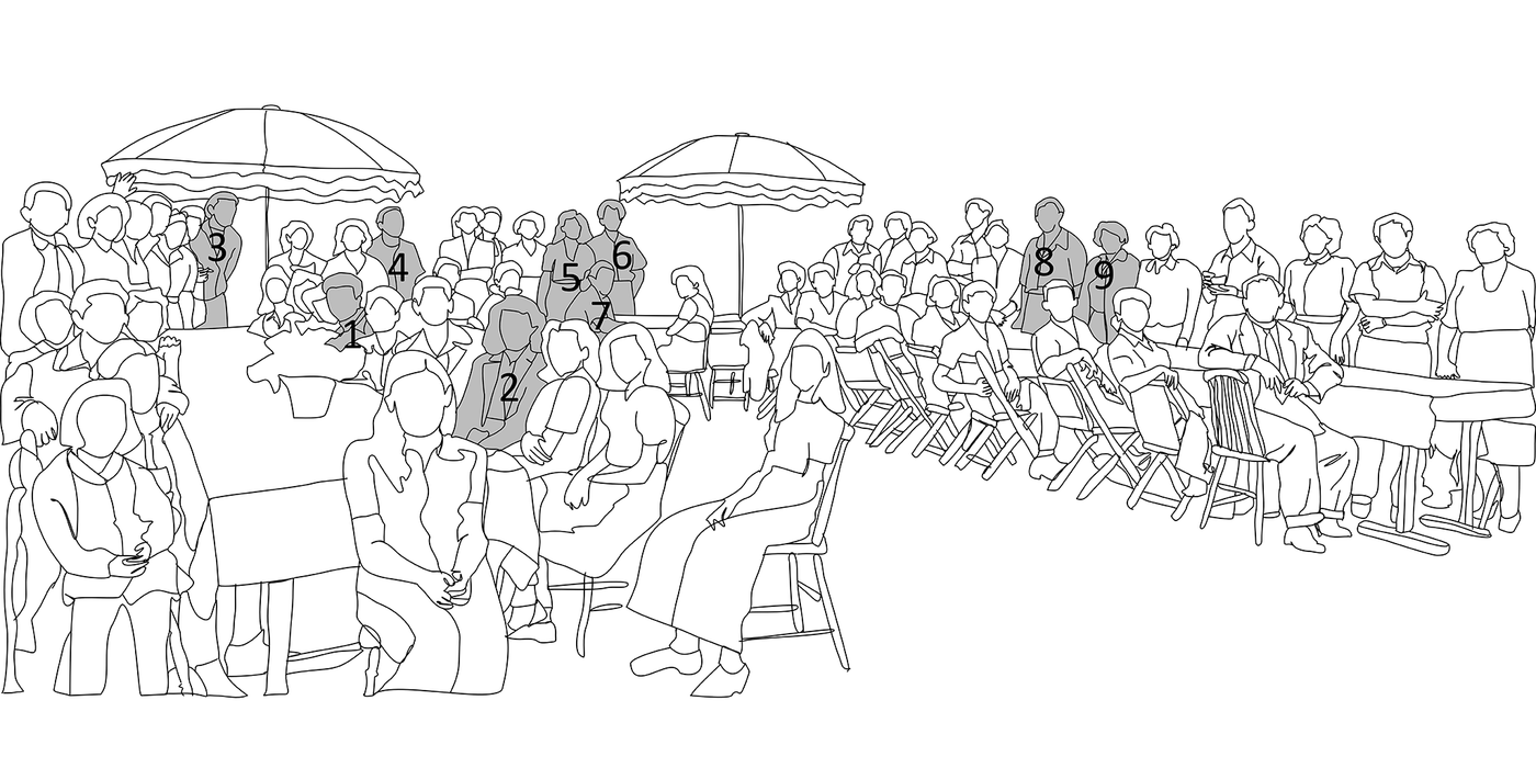 1-Lee, 2-Ronnie, 3-Mac, 4-Pete, 5-6-Luisa and Jack, 8-9-Harry and Doris.